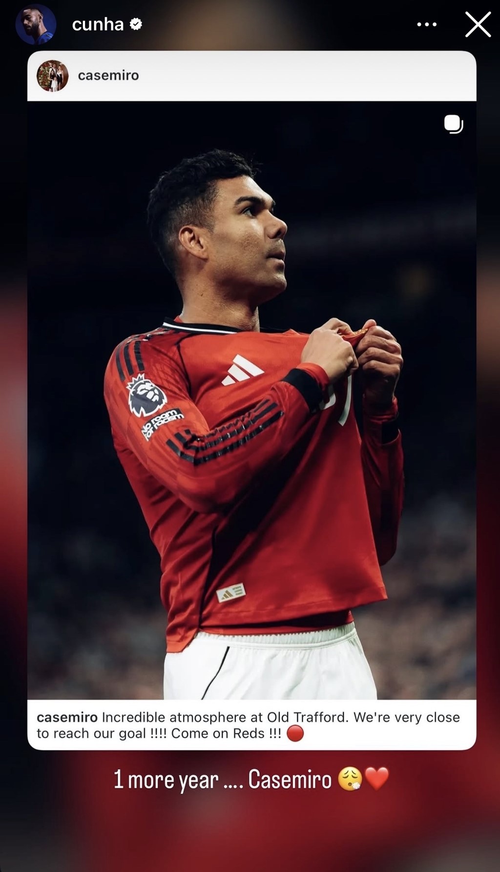 In a post on his Instagram story, Cunha posted "1 more year Casemiro" as he celebrated United's win over Brentford. Cunha missed the game due to injury.